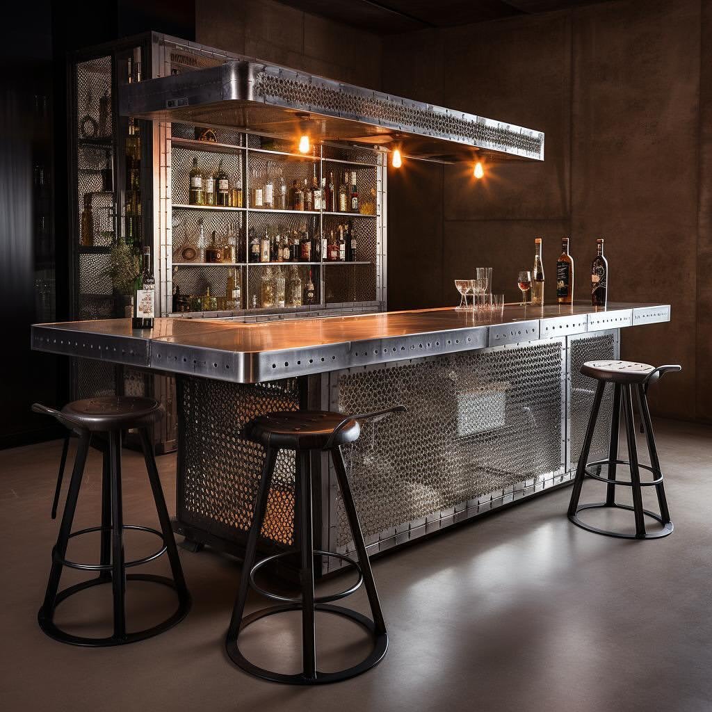 This striking basement bar idea embraces raw industrial aesthetics with perforated steel panels and copper countertops. The metal mesh shelving system creates dramatic visual impact while providing extensive storage for spirits and glassware. Edison bulb lighting suspended from the steel canopy adds authentic industrial charm.