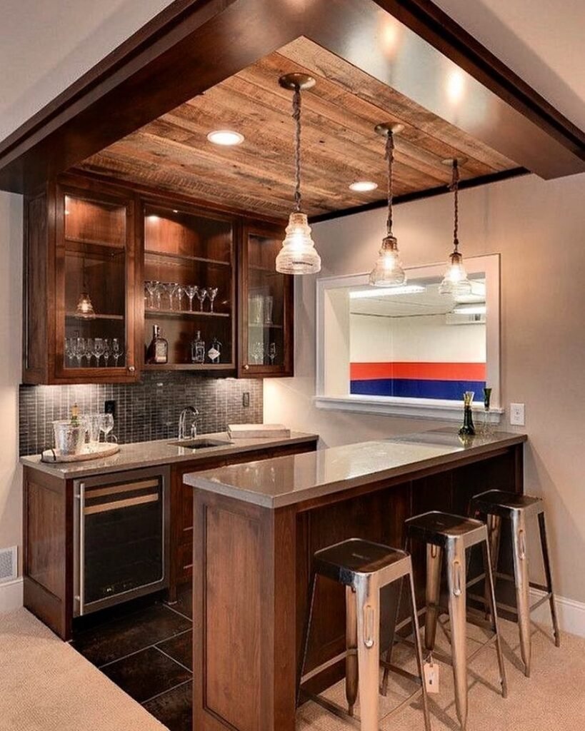 This cozy basement bar idea proves you don’t need massive square footage to create an impressive entertaining space. Rich walnut cabinetry paired with reclaimed wood ceiling planks establishes warmth and sophistication. The three pendant lights with textured glass shades provide both task lighting and visual interest above the bar counter.
