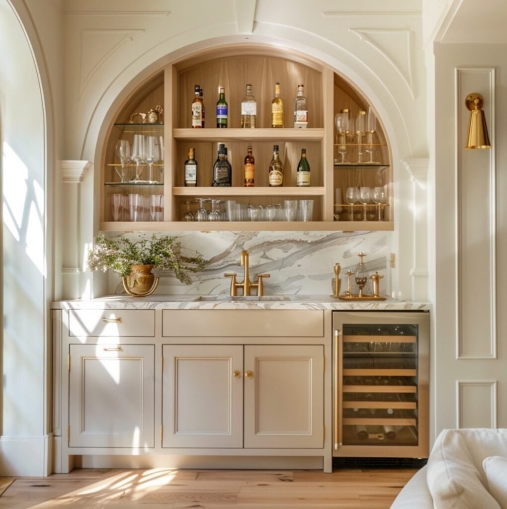 This sophisticated basement bar idea transforms an unused nook into a stunning entertainment hub. The arched alcove creates natural architectural interest while cream cabinetry and marble countertops add timeless elegance. Brass fixtures and thoughtfully placed lighting make the space feel warm and inviting.