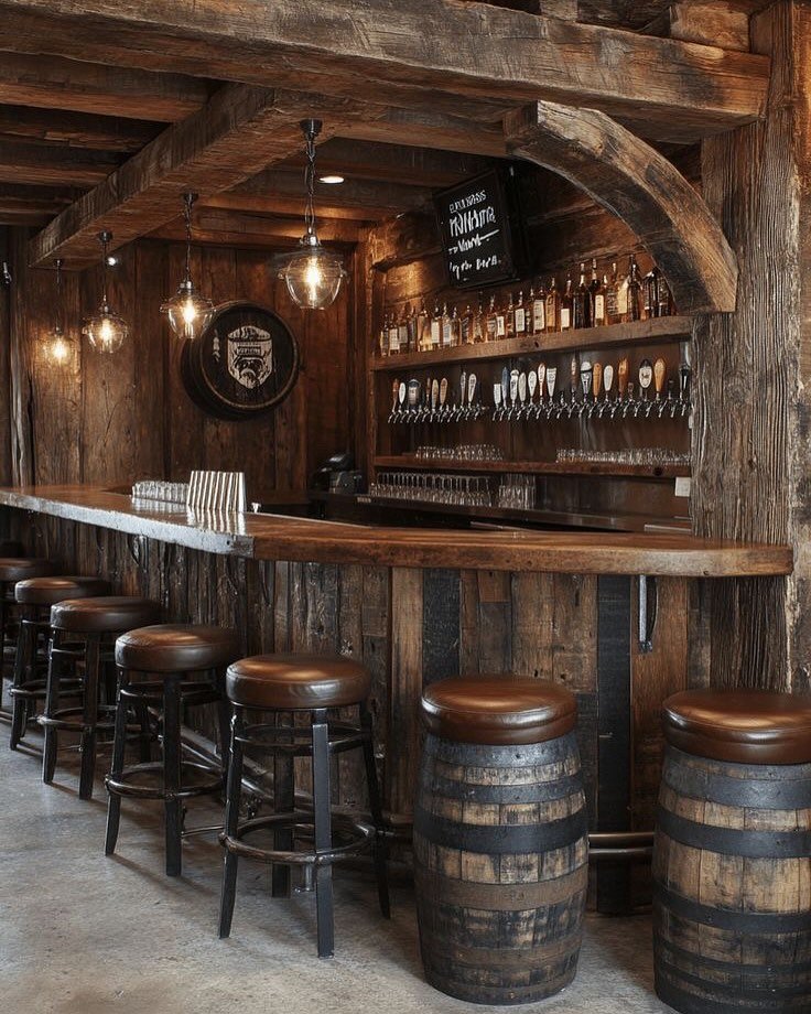 Dark wood paneling on walls and ceiling creates an intimate, cozy atmosphere that encourages lingering conversations. This basement bar idea appeals to craft beer enthusiasts and anyone who appreciates historical design elements. The weathered materials and vintage accessories transport visitors to a different era entirely.