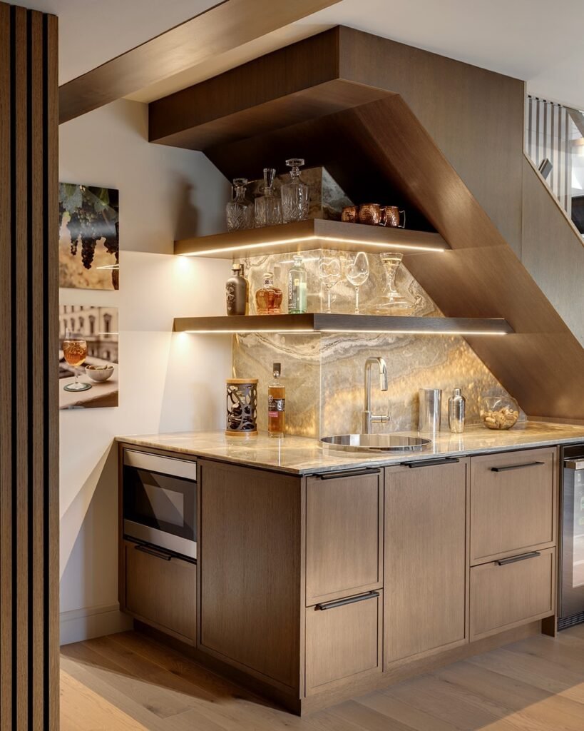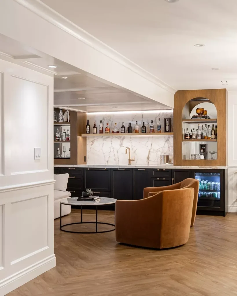 Wood accent panels introduce warmth and texture, preventing the space from feeling too stark. Open shelving displays spirits and glassware while maintaining easy access for entertaining. The built-in beverage cooler eliminates trips upstairs during parties.