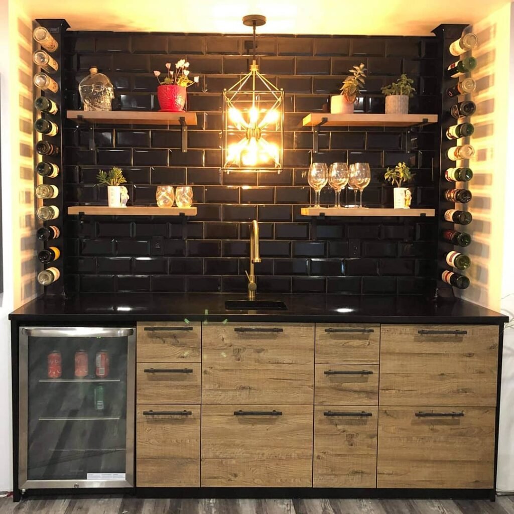 This basement bar idea embraces drama with glossy black subway tiles that create stunning visual impact against warm wood cabinetry. The geometric pendant light fixture adds sculptural interest while vertical wine storage on both sides frames the space beautifully. Brass accents throughout the design bring warmth and sophistication to the bold color palette.