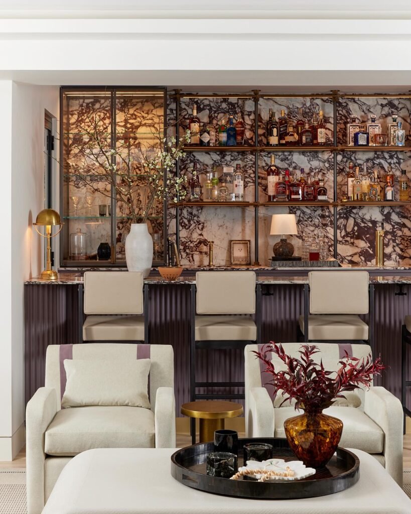 This basement bar idea showcases how statement materials can transform your entertaining space into something extraordinary. The bookmatched marble behind floor-to-ceiling shelving creates a dramatic focal point that rivals any upscale restaurant or hotel bar.