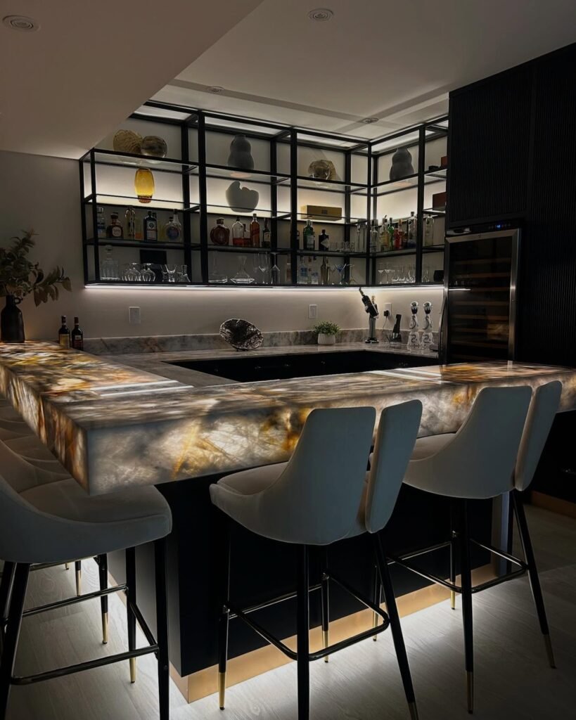 This sophisticated basement bar idea treats your space like a modern art gallery with dramatic onyx countertops and sleek black metal shelving. The backlit translucent stone creates stunning visual effects that change throughout the day. Open geometric shelving displays bottles and decorative objects like museum pieces.