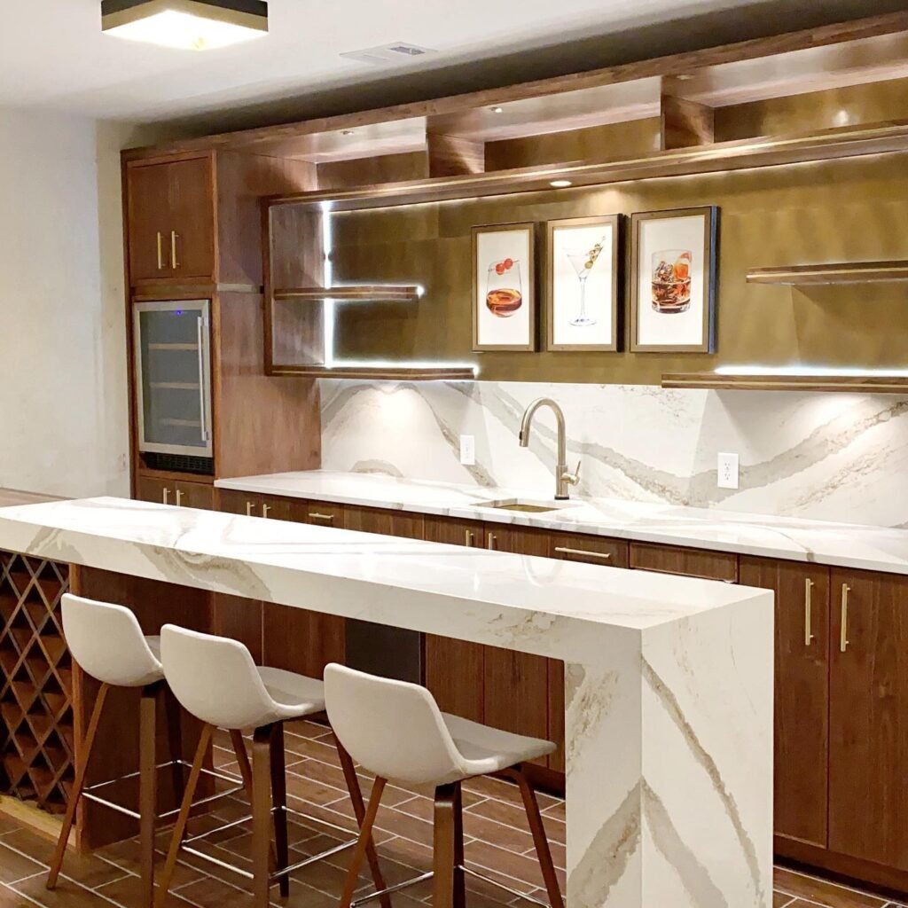 Stunning white marble with dramatic gray veining elevates this basement bar idea into luxury territory. The waterfall edge on the bar island creates a seamless, sculptural element that serves as the room’s centerpiece. Rich walnut cabinetry provides beautiful contrast while maintaining warmth in the space.