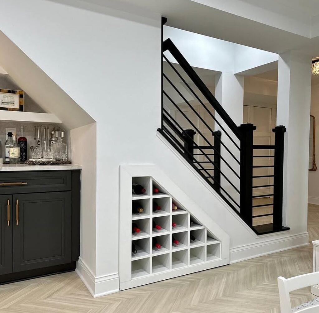 This clever basement bar idea maximizes every inch of available space by transforming the area beneath your staircase into a sophisticated wine storage system. The built-in cubby holes create an organized display for your collection while maintaining easy access to your favorites. Dark green cabinetry adds rich contrast against crisp white walls, creating visual depth that makes the space feel larger.