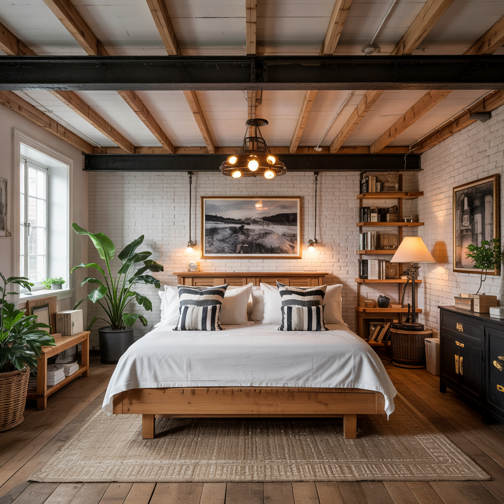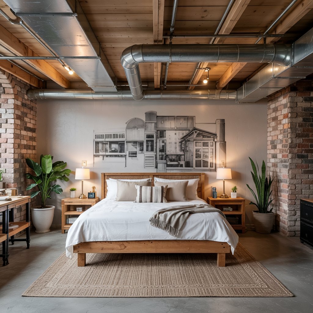 I embrace the exposed utility aesthetic by painting pipes and ducts as part of my industrial design. Rather than hiding these elements, I make them intentional design features.