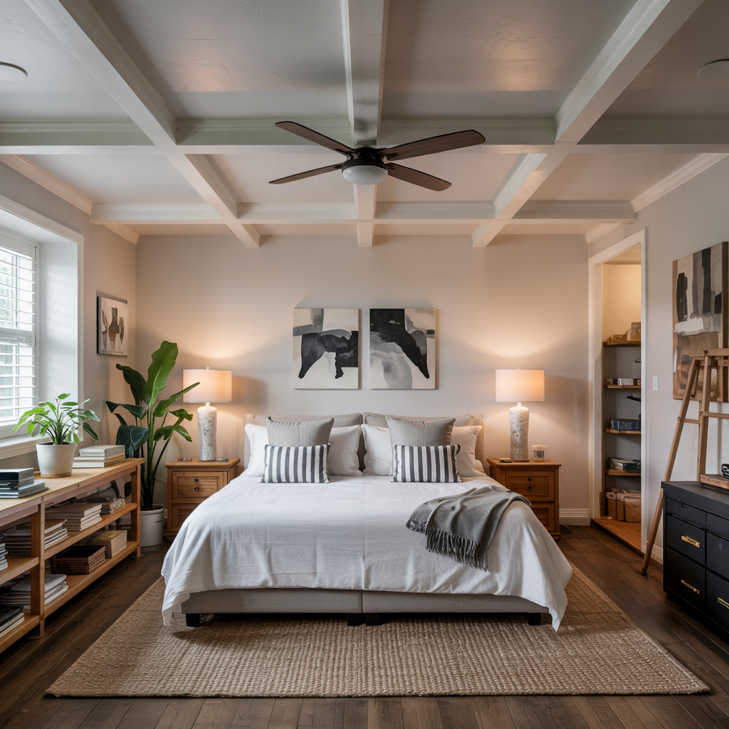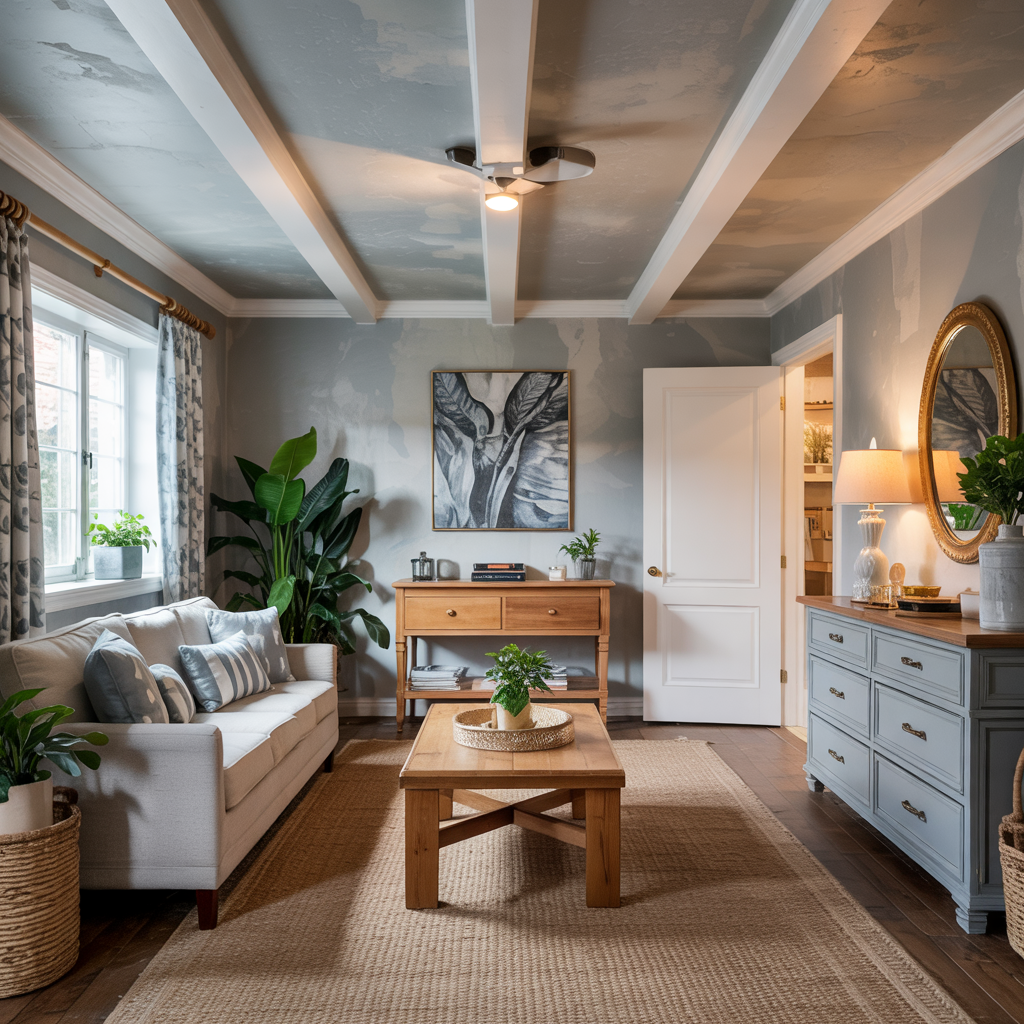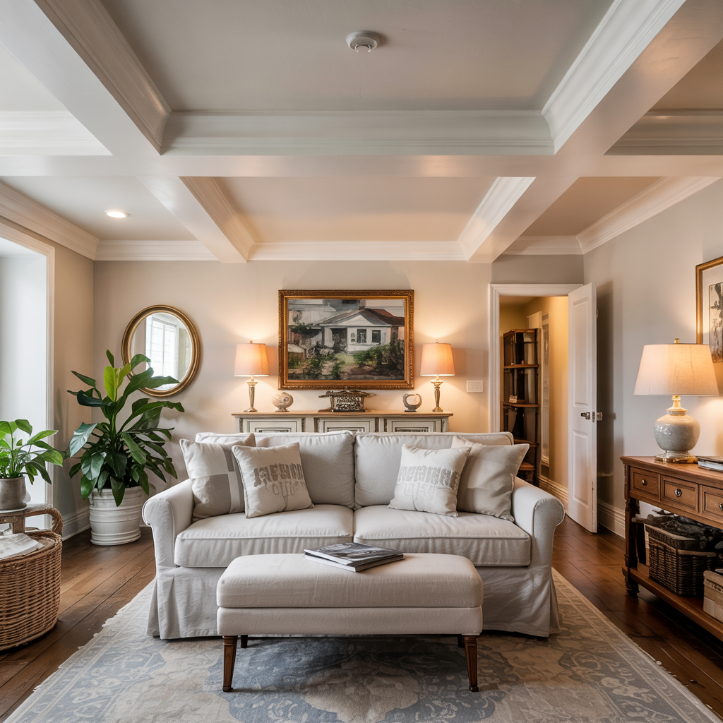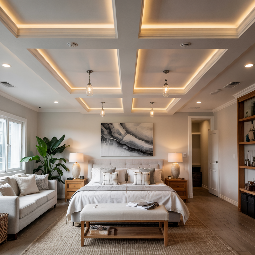 I upgrade basic drywall by incorporating tray or stepped ceiling designs. This architectural detail creates the illusion of height while concealing ductwork or structural beams.