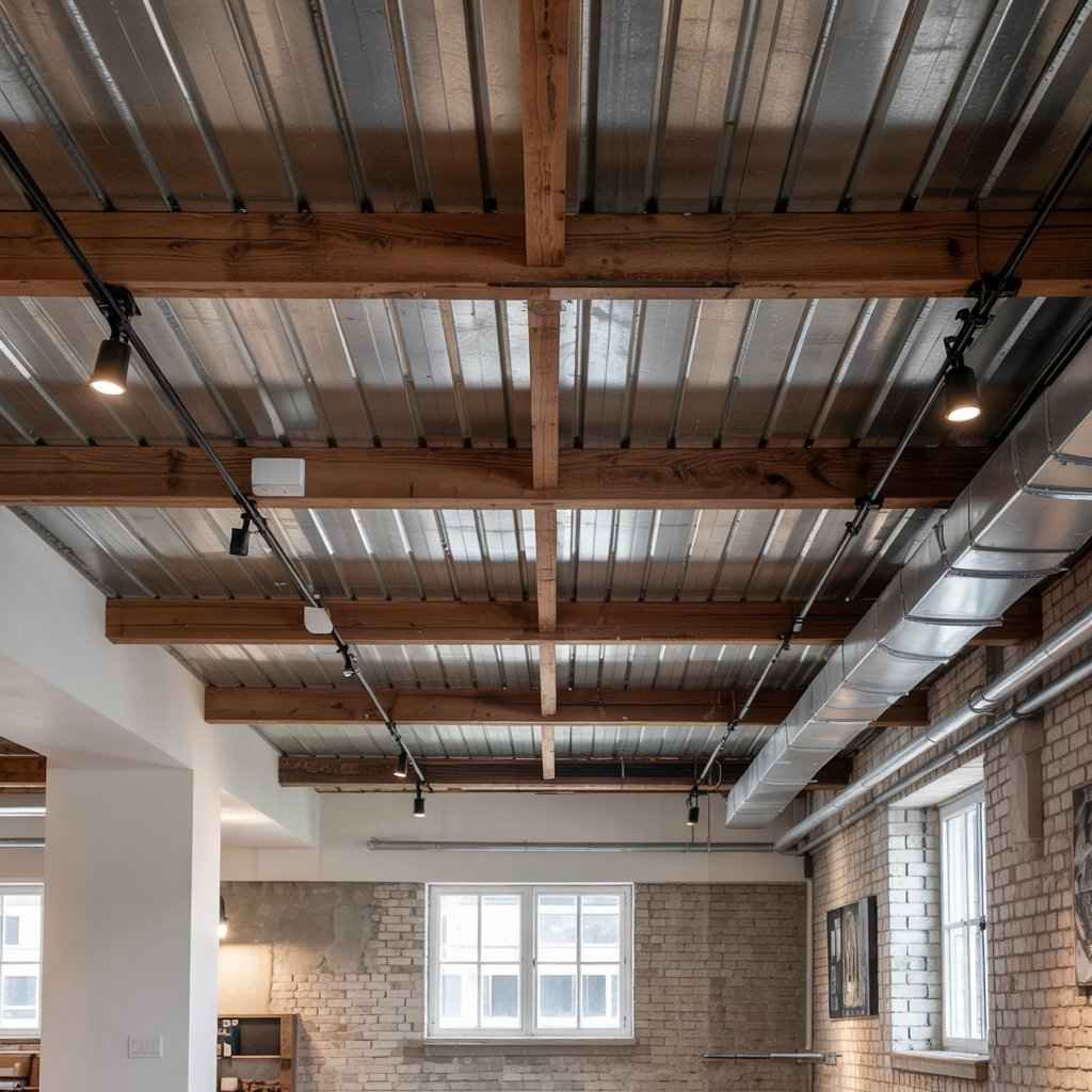 Metal panel ceilings bring authentic industrial style to my basement. I use corrugated metal as the main material and enhance it with track lighting to emphasize the industrial aesthetic.