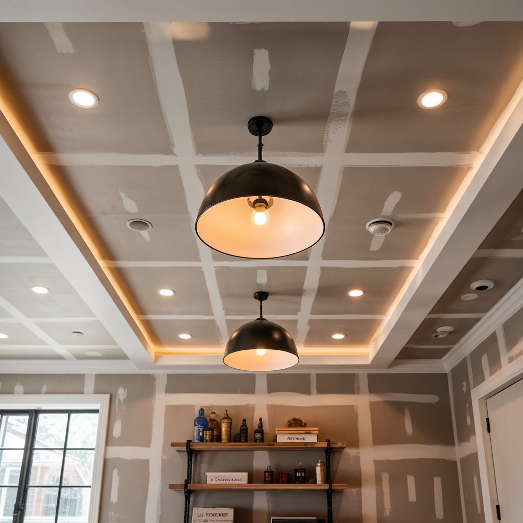 I design my basement ceiling to feature integrated pendant lights as both functional illumination and design elements. The primary material is drywall, but the pendant lights become the focal points.