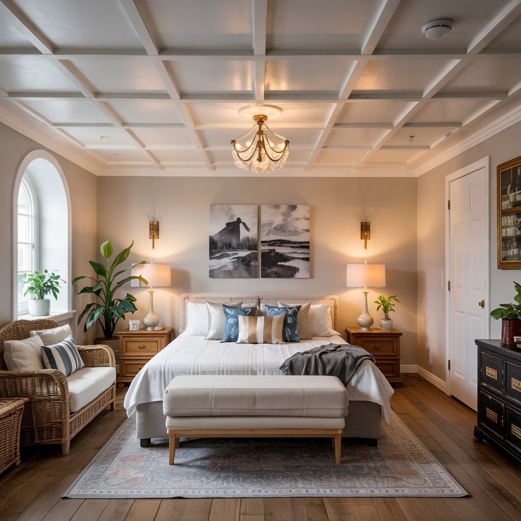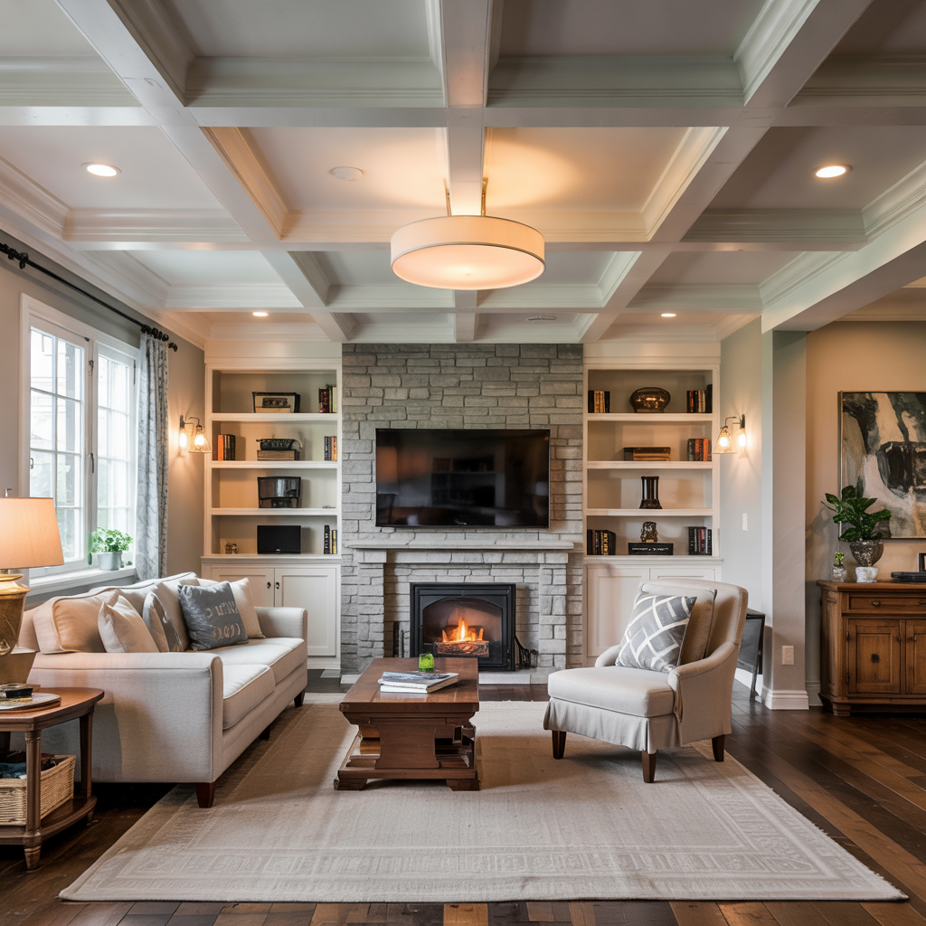 A coffered ceiling transforms my basement into something truly special. I install grid-style beams to create recessed panels that add incredible depth and sophistication to the space.
