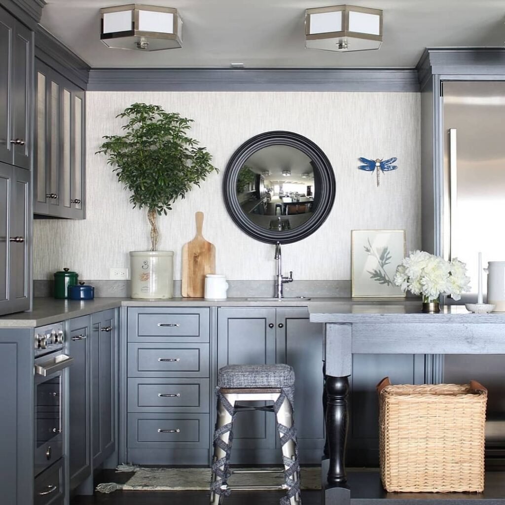 This basement kitchenette showcases the power of monochromatic elegance. The deep gray cabinetry creates a cocoon-like atmosphere that feels both cozy and refined. Notice how the white grasscloth wallpaper adds texture without overwhelming the space, while the convex mirror reflects light to prevent that dreaded basement cave feeling.