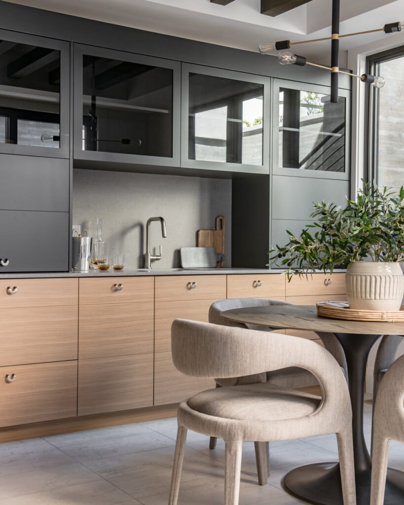 Mixed materials make this basement kitchenette sing with personality. The charcoal upper cabinets paired with warm wood lower storage creates visual layers that keep the eye engaged. Those glass front doors prevent the dark color from feeling heavy while showcasing beautiful dishware.