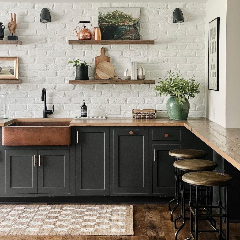 Black pendant lights with greenery accents provide both illumination and natural elements. The generous island offers extra prep space and storage solutions for busy entertaining. Floating shelves display dishes and décor against the textured brick backdrop.