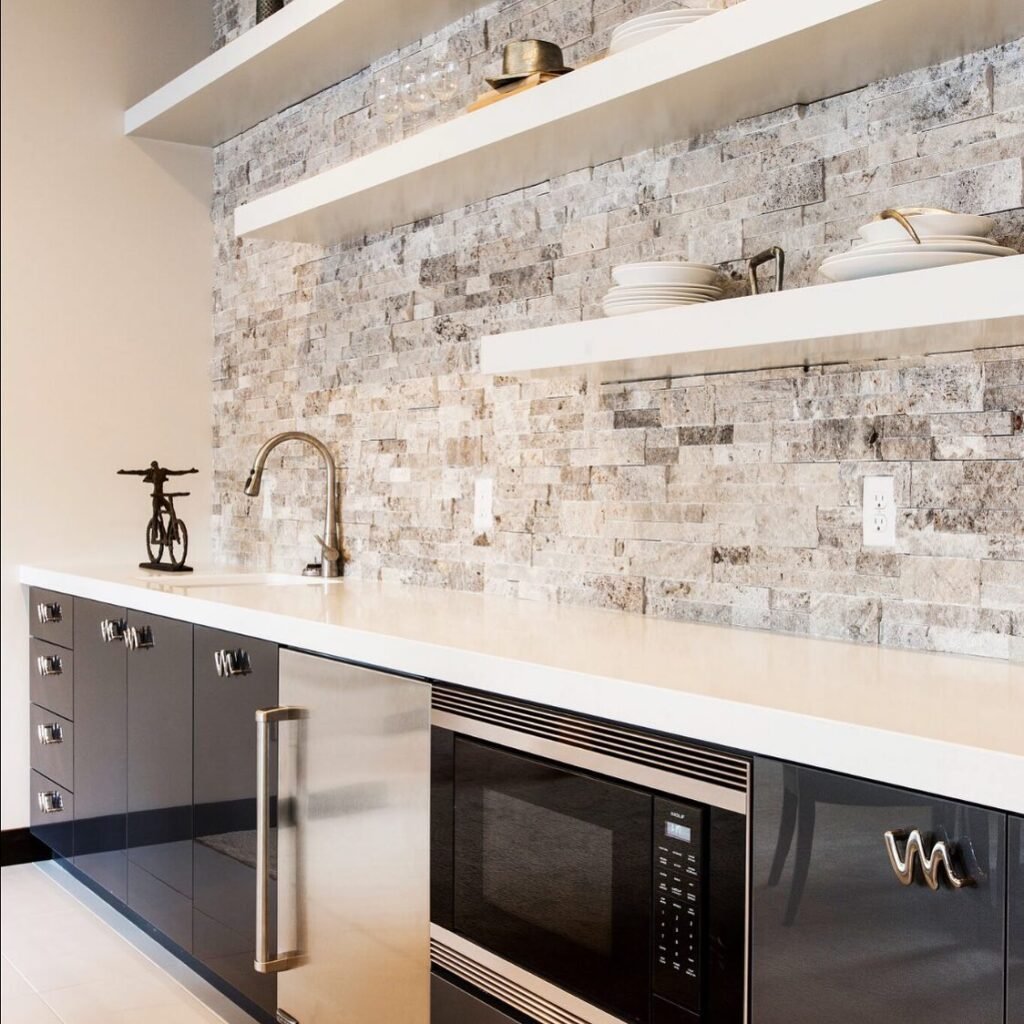 This contemporary basement kitchenette features dramatic stone accent walls that create visual impact in the lower level. The natural travertine adds texture and sophistication while maintaining a neutral color palette. Charcoal gray cabinetry provides striking contrast against the light stone backdrop.