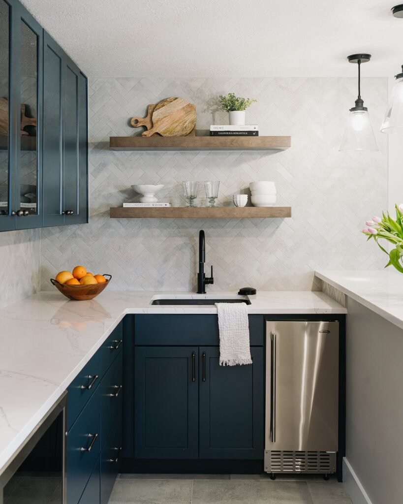 This navy blue basement kitchenette proves that small spaces can pack serious style. The rich teal cabinetry creates striking contrast against crisp white marble countertops and herringbone subway tile backsplash. Smart design choices maximize every inch – floating wooden shelves display dishes and décor while keeping essentials within reach.