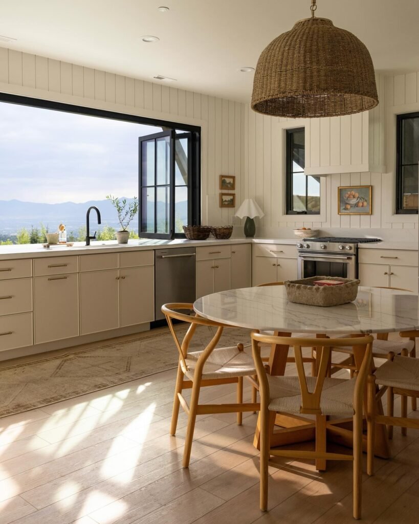 The vertical wood paneling adds architectural interest without overwhelming the space. It creates a backdrop that feels both modern and cozy. The round dining table with wishbone chairs brings Scandinavian simplicity to the equation.
