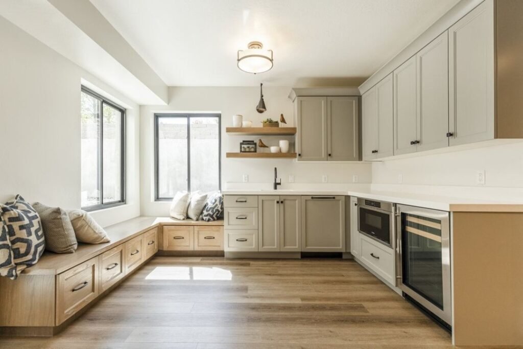 Natural light transforms this basement kitchenette into something extraordinary. The large windows flood the space with sunshine, while the neutral color palette keeps things serene. Those warm gray cabinets strike the right balance between contemporary and timeless.
