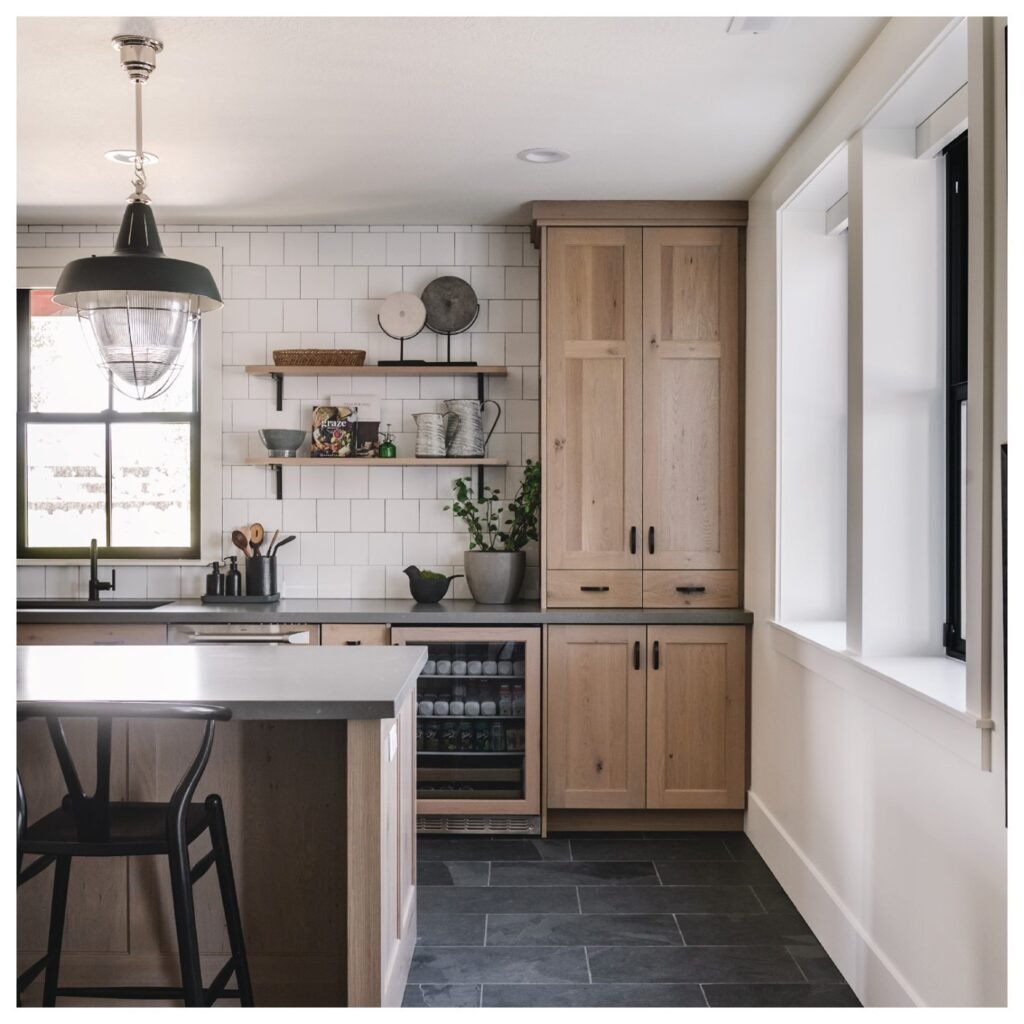 Black window frames create striking contrast against the neutral palette. This basement kitchenette demonstrates how natural wood finishes can prevent lower level spaces from feeling cold or unwelcoming. The combination of textures and warm tones makes this area feel like an extension of the main living spaces.