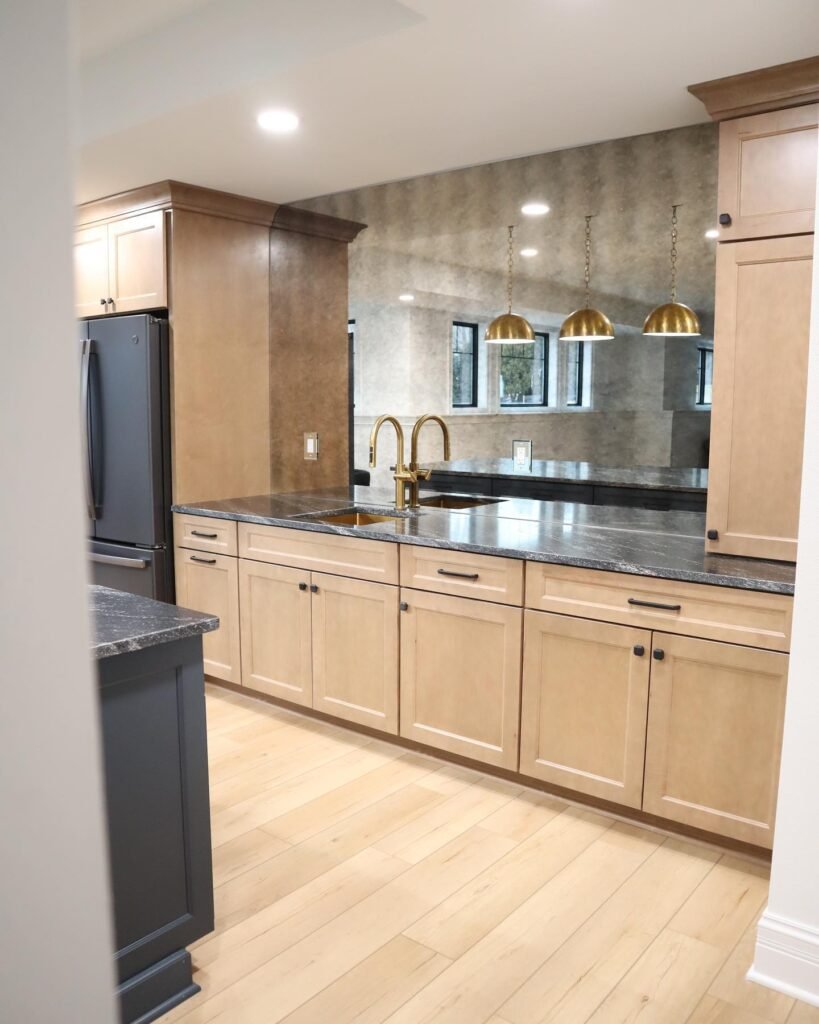 This basement kitchenette embraces natural wood cabinetry that brings organic warmth to the lower level. The light oak finish creates a bright, welcoming atmosphere while dramatic granite countertops add luxury appeal. Golden pendant lights provide focused task lighting over the workspace.