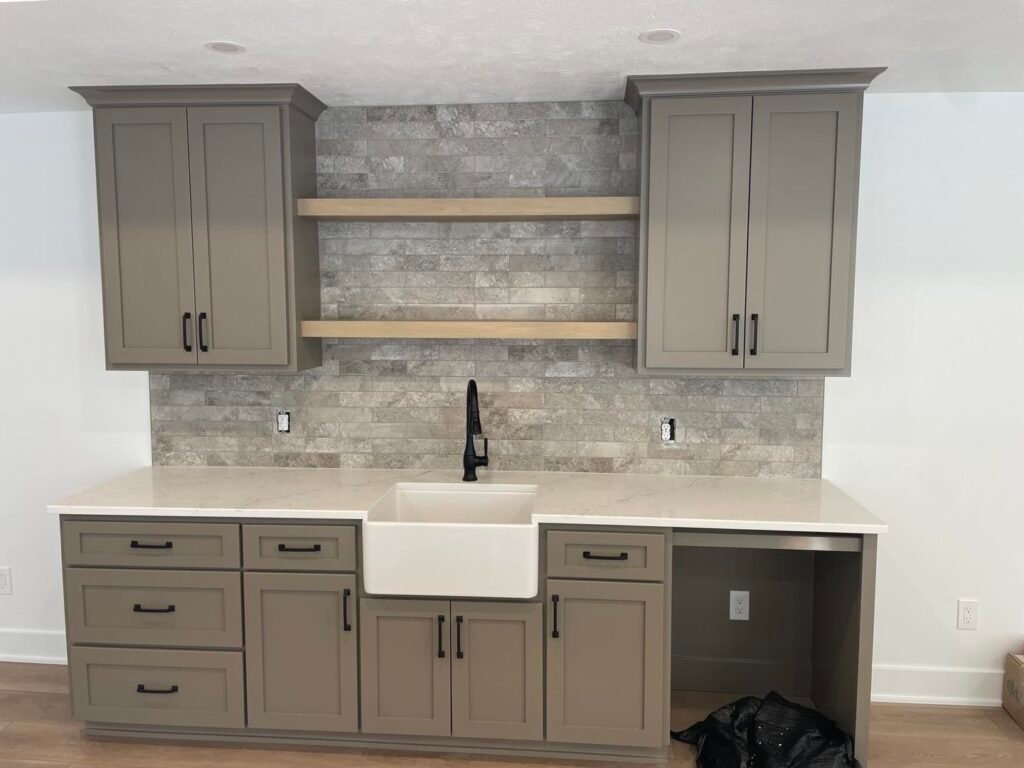 This sage green basement kitchenette embraces farmhouse charm with shaker-style cabinets and a gorgeous apron front sink. The neutral palette creates a calming atmosphere that feels both timeless and fresh. Substantial crown molding and quality construction details elevate this space beyond typical basement renovations.