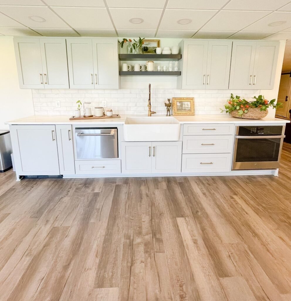 Open shelving displays everyday dishes while providing easy access during meal preparation. The farmhouse sink anchors the design with traditional appeal. Luxury vinyl plank flooring mimics hardwood while offering durability for basement conditions.