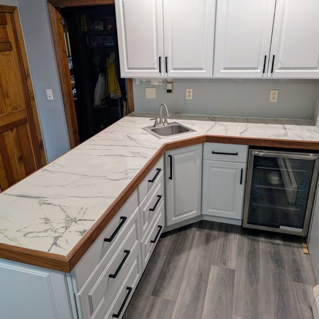 This basement kitchenette layout encourages interaction between the host and guests. The marble-look countertops provide easy cleanup after parties, while the stylish backsplash ensures this space photographs well for social media. Every detail works together to create an Instagram-worthy basement kitchenette that friends will remember.