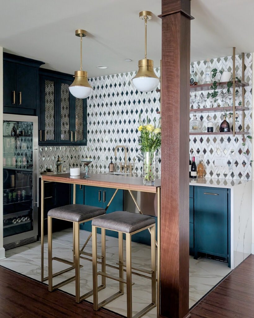 This basement kitchenette takes entertaining seriously with its stunning diamond-pattern backsplash that commands attention. The navy cabinetry with brass hardware continues the luxury theme while providing ample storage for barware and supplies. A dedicated wine refrigerator keeps beverages at the right temperature.