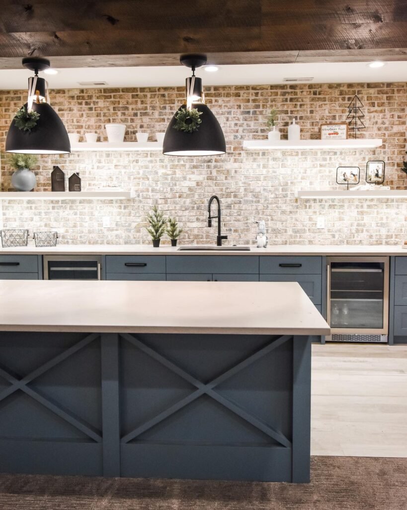 This farmhouse basement kitchenette showcases stunning exposed brick walls that bring authentic character to the lower level. The warm brick backsplash creates a cozy atmosphere while gray cabinetry with X-panel details adds rustic charm. Reclaimed wood ceiling beams enhance the farmhouse aesthetic throughout this inviting space.