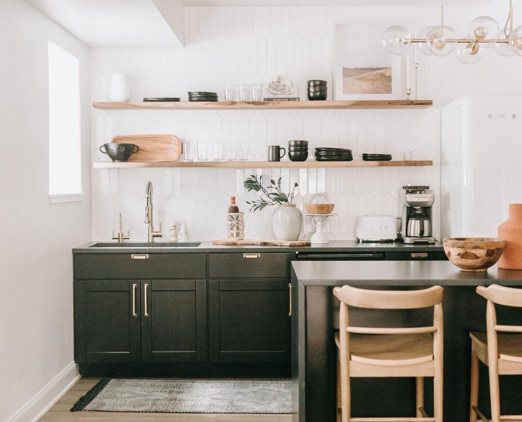 This charming basement kitchenette maximizes every inch with smart storage solutions and natural wood cabinetry. The white subway tile backsplash keeps the space feeling bright despite the lower level location. Open shelving with black brackets displays essentials while maintaining an airy feel.