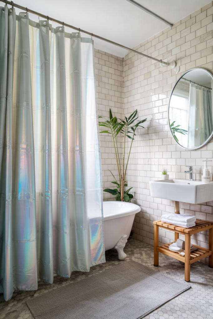 Make a bold statement with holographic or iridescent curtain panels that shift colors as light hits them from different angles.