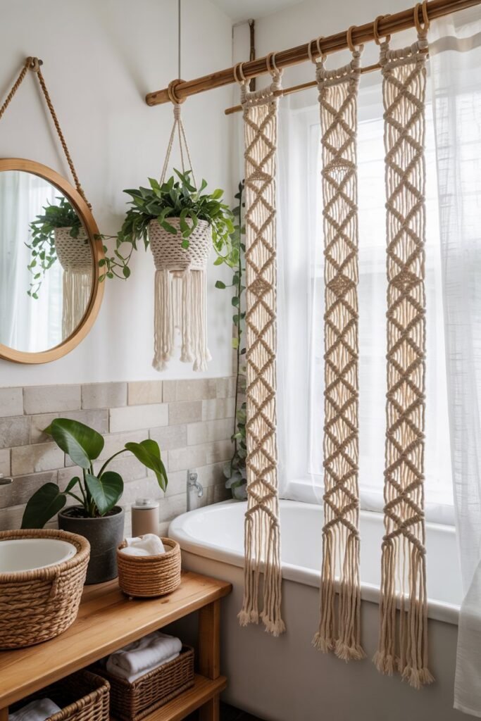 Bring bohemian chic into your bathroom with handwoven macramé curtain panels.