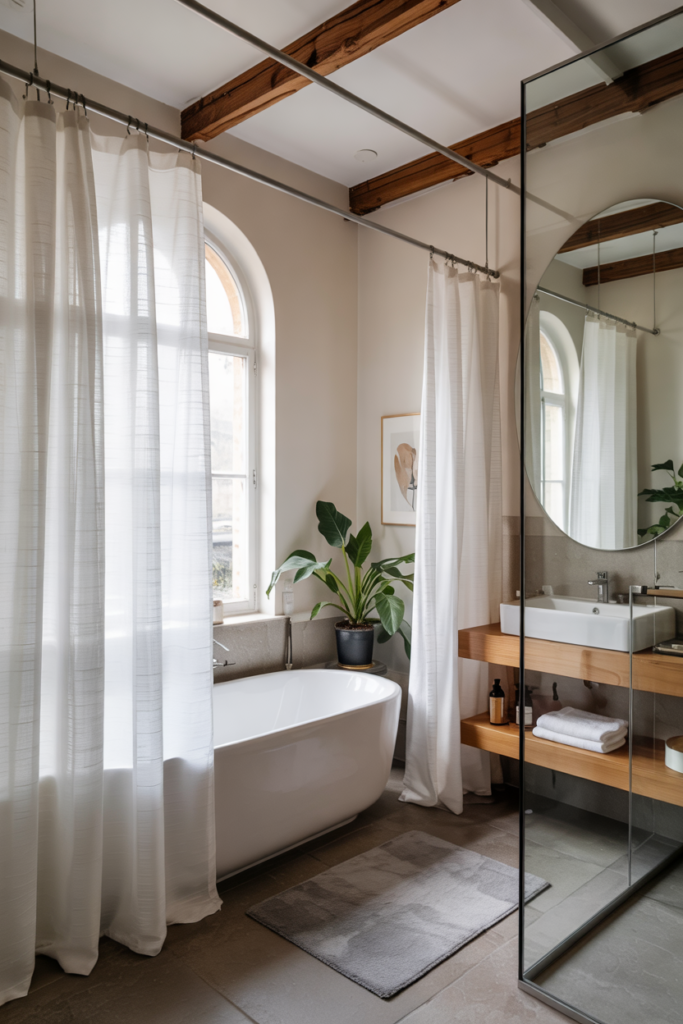 Floor-length curtains are also ideal for concealing storage areas or creating a cozy, enclosed feel in spacious bathrooms.