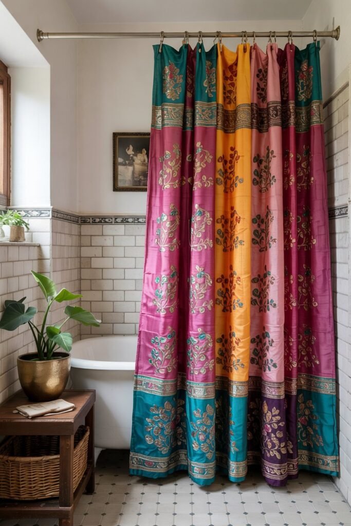 Repurpose beautiful vintage sari fabrics into one-of-a-kind bathroom curtains.