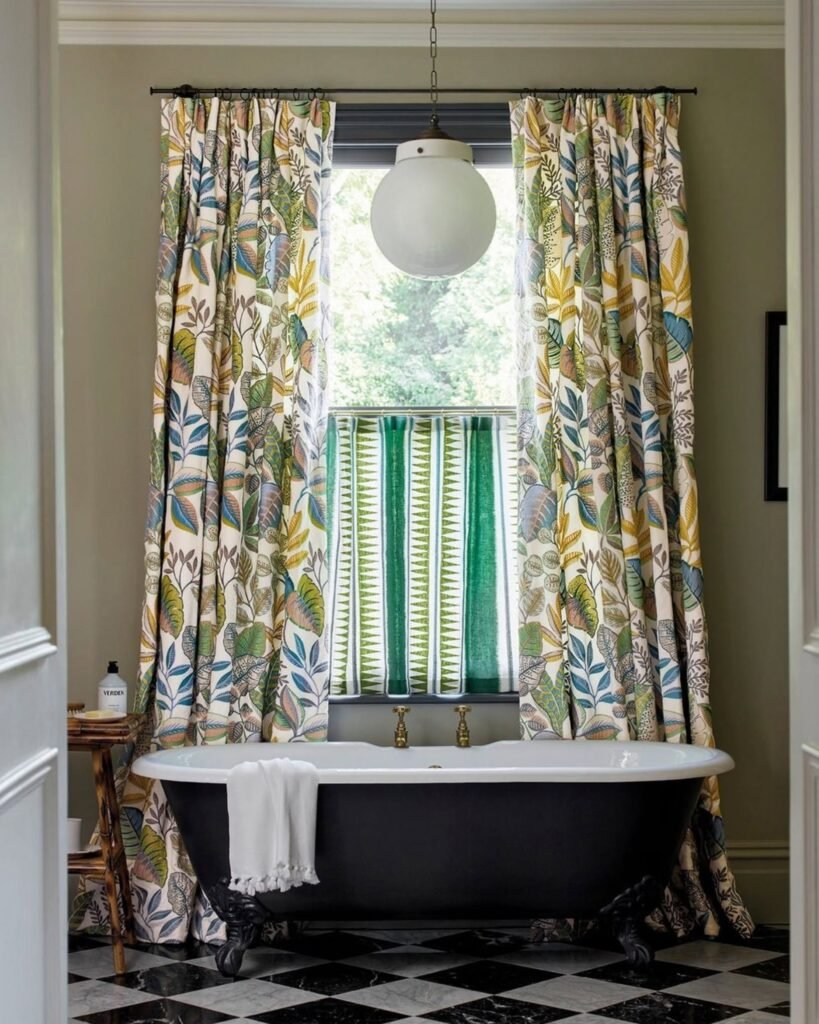 These curtains frame a charming clawfoot tub positioned near the window. The pattern adds energy and freshness to the neutral bathroom palette.