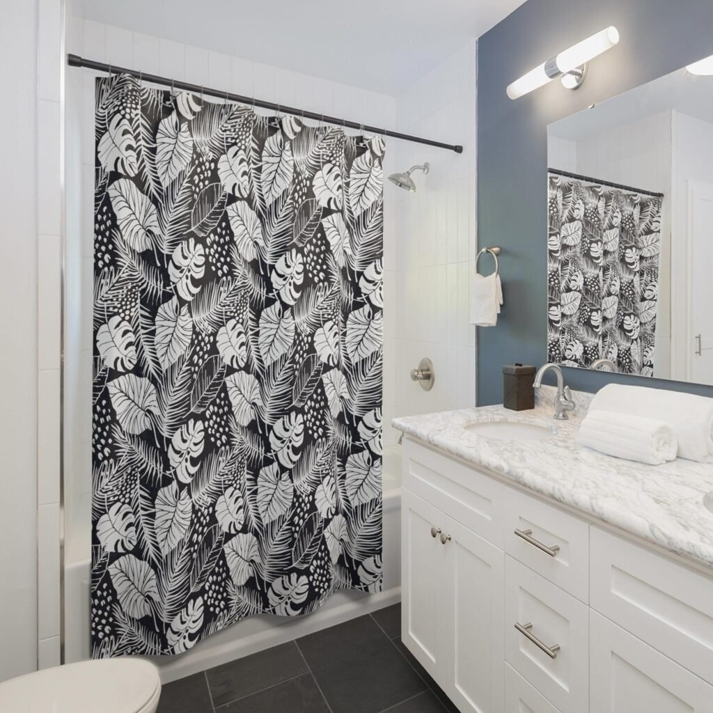 A striking monochrome shower curtain displays oversized palm fronds and tropical leaves. The high-contrast pattern creates visual drama in this contemporary bathroom space.