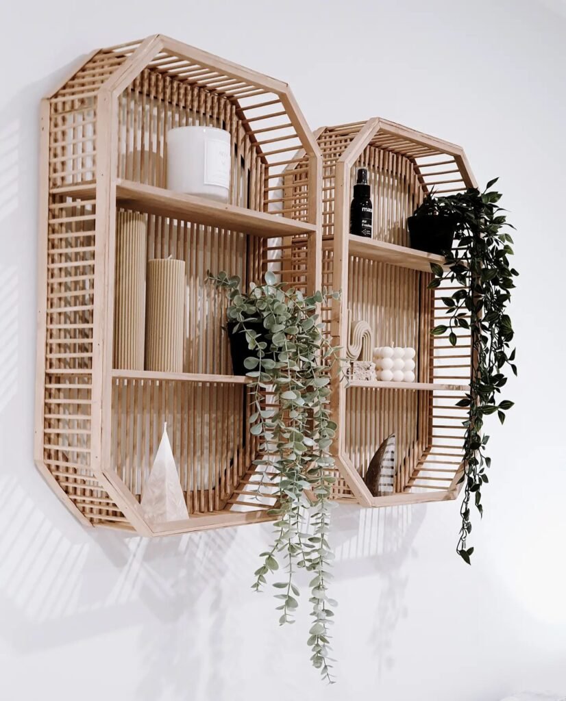 The geometric design catches the eye while providing practical storage. Trailing plants soften the structured lines and bring life to the display. This bedroom storage idea works particularly well above desks or dressing areas where you need daily essentials within reach.