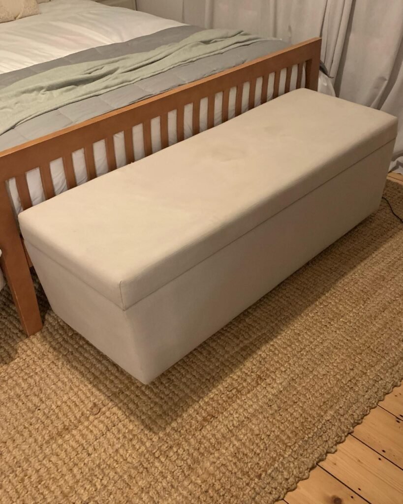 This cream-colored storage bench sits beautifully at the foot of a wooden bed, proving that bedroom storage ideas can be both functional and elegant. The upholstered ottoman opens to reveal hidden compartment space, making it a smart choice for storing extra blankets, pillows, or seasonal clothing.