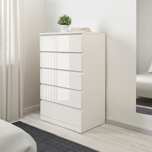 This sleek white chest of drawers maximizes vertical space for bedroom storage ideas that really work. Five deep drawers provide ample room for clothing, accessories, and personal items while maintaining a clean, minimalist appearance.