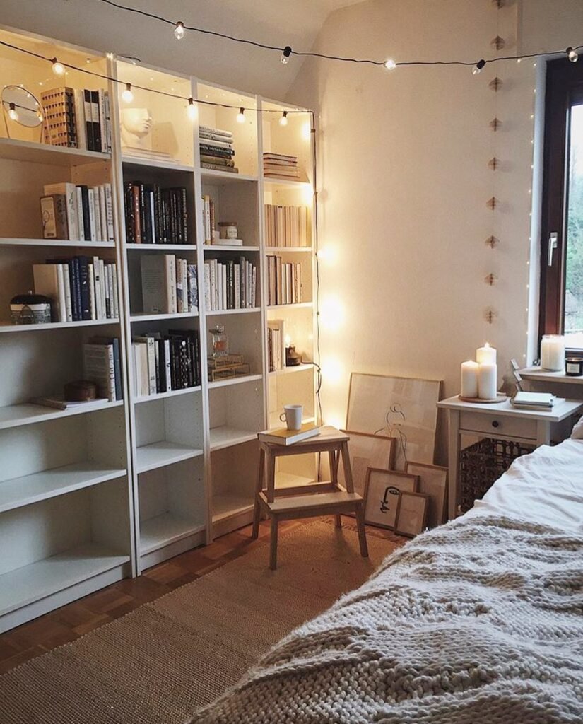 This bedroom storage idea brings literary magic to your sleeping space. The tall white shelving unit creates a stunning library wall that stores hundreds of books while adding character. Small LED lights illuminate each shelf, making your collection a decorative feature.