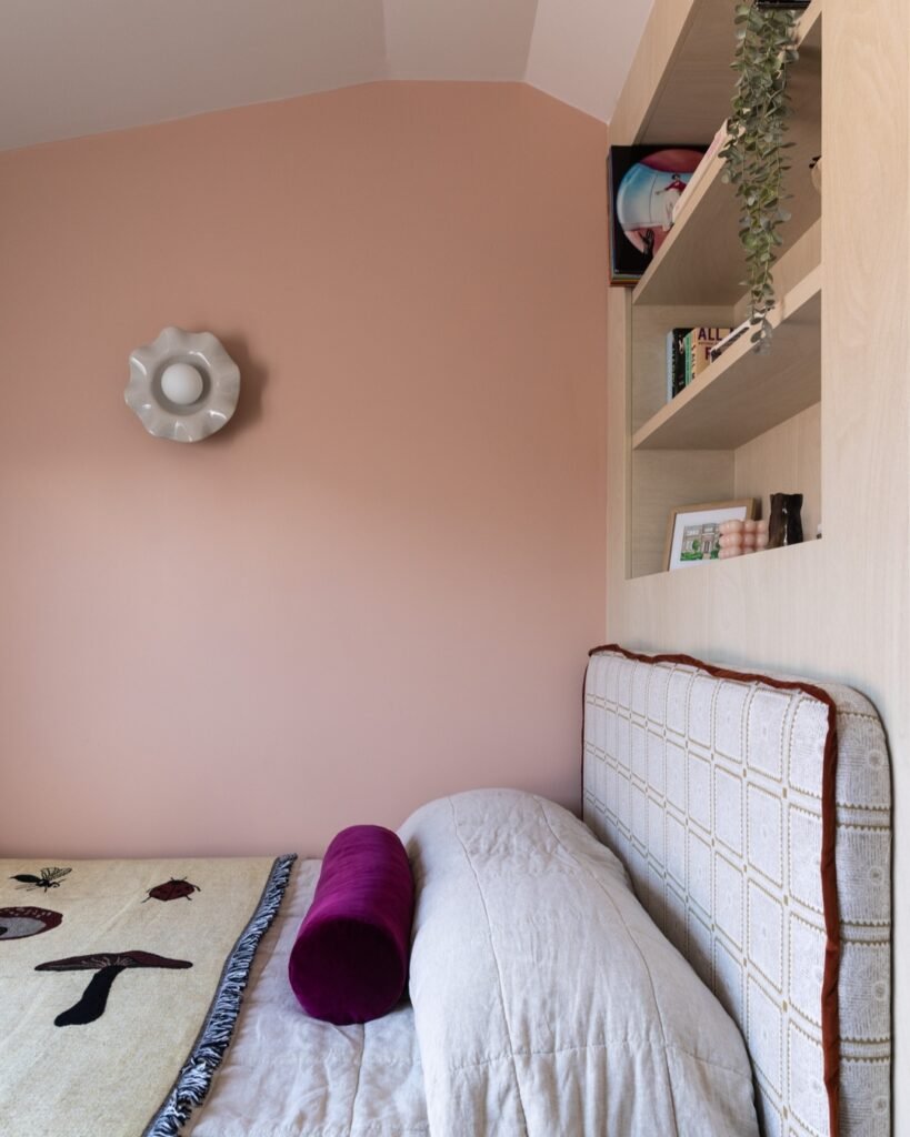 This built-in corner unit shows how bedroom storage ideas can turn unused areas into functional zones. Three open shelves display books, decor, and personal items while keeping them easily accessible. The pink accent wall creates a cozy reading nook atmosphere.