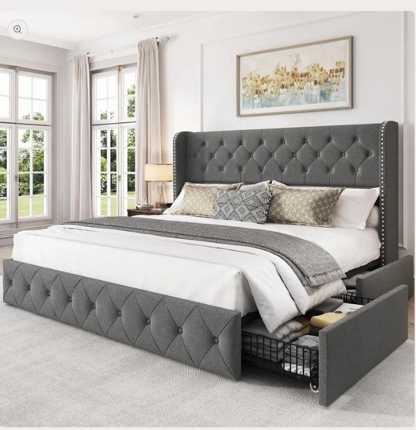This tufted gray bed frame elevates bedroom storage ideas to new heights of sophistication. The upholstered base conceals spacious drawers that slide out smoothly, providing hidden storage without compromising the bed’s elegant appearance. The diamond-tufted headboard adds visual interest while the nail head trim creates a custom, high-end look.