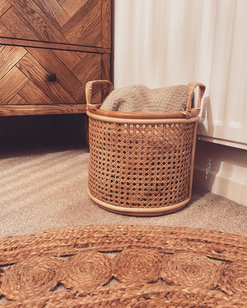This gorgeous rattan basket demonstrates how bedroom storage ideas can be both beautiful and functional. The natural cane weaving adds texture and warmth to any space while hiding blankets, pillows, or seasonal clothing. The sturdy handles make it easy to move around when needed.