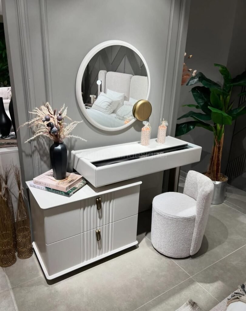 This sleek white vanity combines beauty routines with bedroom storage needs. The curved design features hidden drawers and compartments that organize makeup, skincare products, and jewelry. The floating design keeps floor space clear while the rounded mirror adds softness to angular furniture.