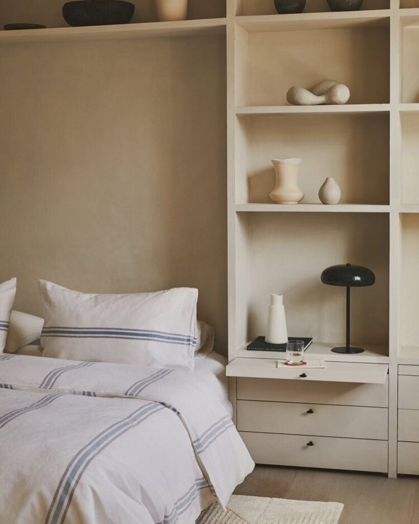 This sophisticated bedroom storage idea showcases custom built-in solutions at their finest. The combination of open shelving and closed drawers creates visual interest while hiding clutter. Each shelf displays ceramic pieces and books with museum-like precision.