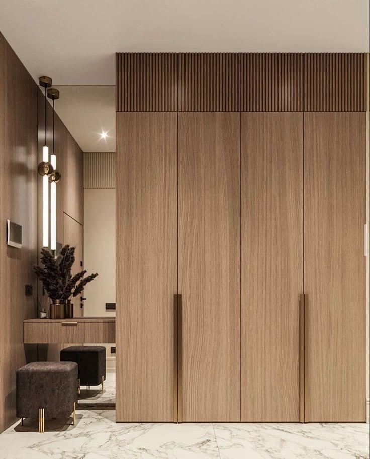 This stunning wood wardrobe creates a complete bedroom storage system. The floor-to-ceiling design maximizes every inch of wall space while the fluted wood detailing adds architectural interest. Multiple compartments handle everything from hanging clothes to folded items and accessories.