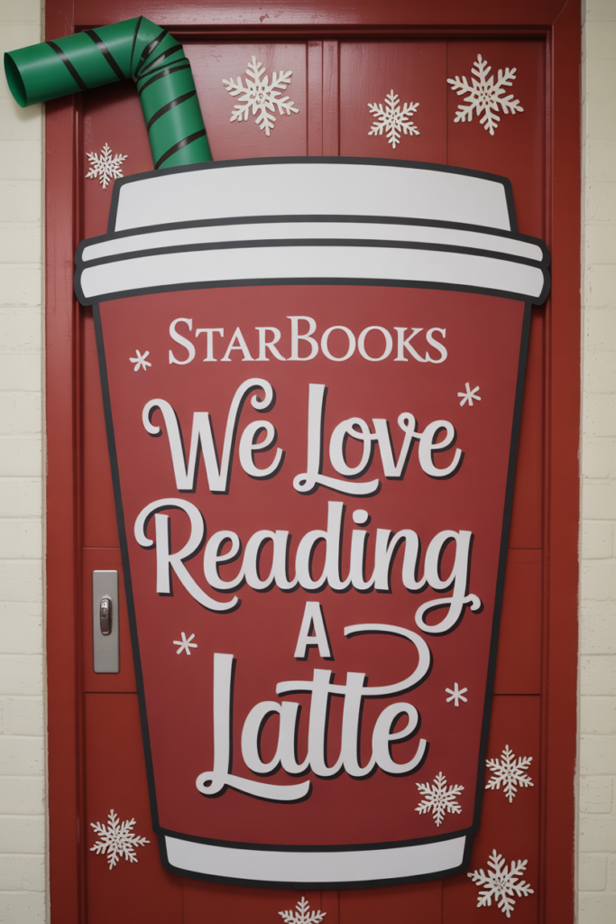 As a coffee-loving teacher, I couldn’t resist this clever play on words. I transform the door into a giant holiday coffee cup similar to those iconic red Starbucks cups, complete with “Starbooks” branding.