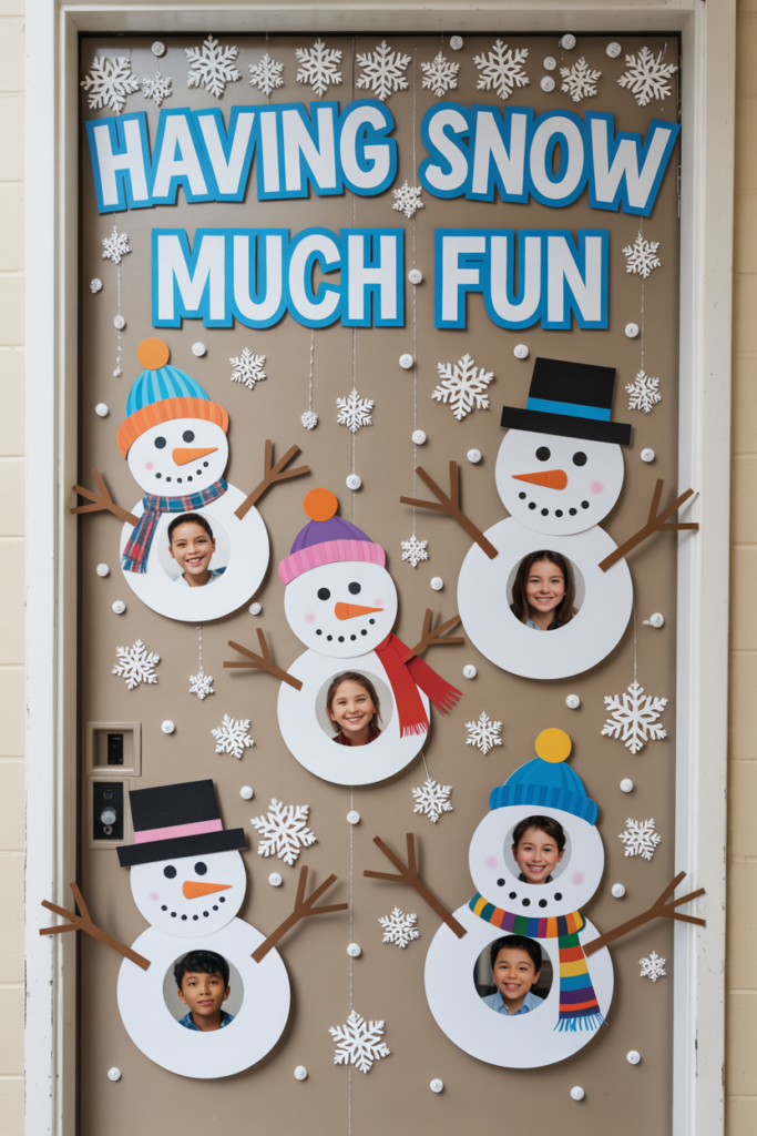 I create this winter theme using snowman cutouts with each student’s photo attached to make personalized snow people. I add paper snowflakes falling all around and use the cheerful heading “Having Snow Much Fun.”