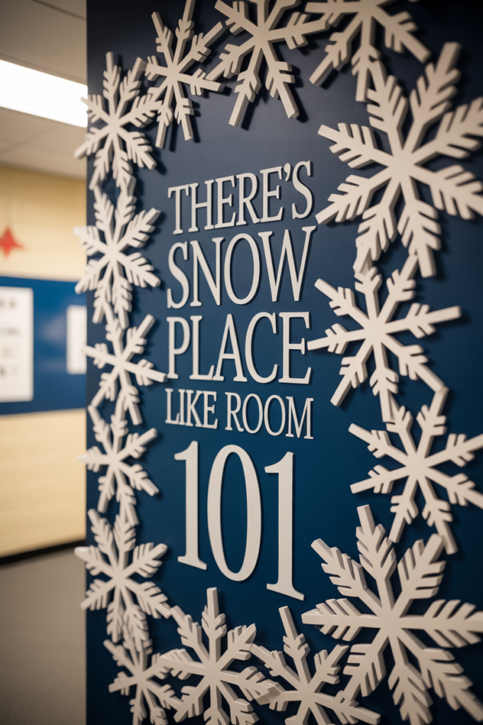I fill in our specific room number in the heading, making it personalized to our classroom. The contrast of white snowflakes against the dark background creates a beautiful, welcoming entrance.