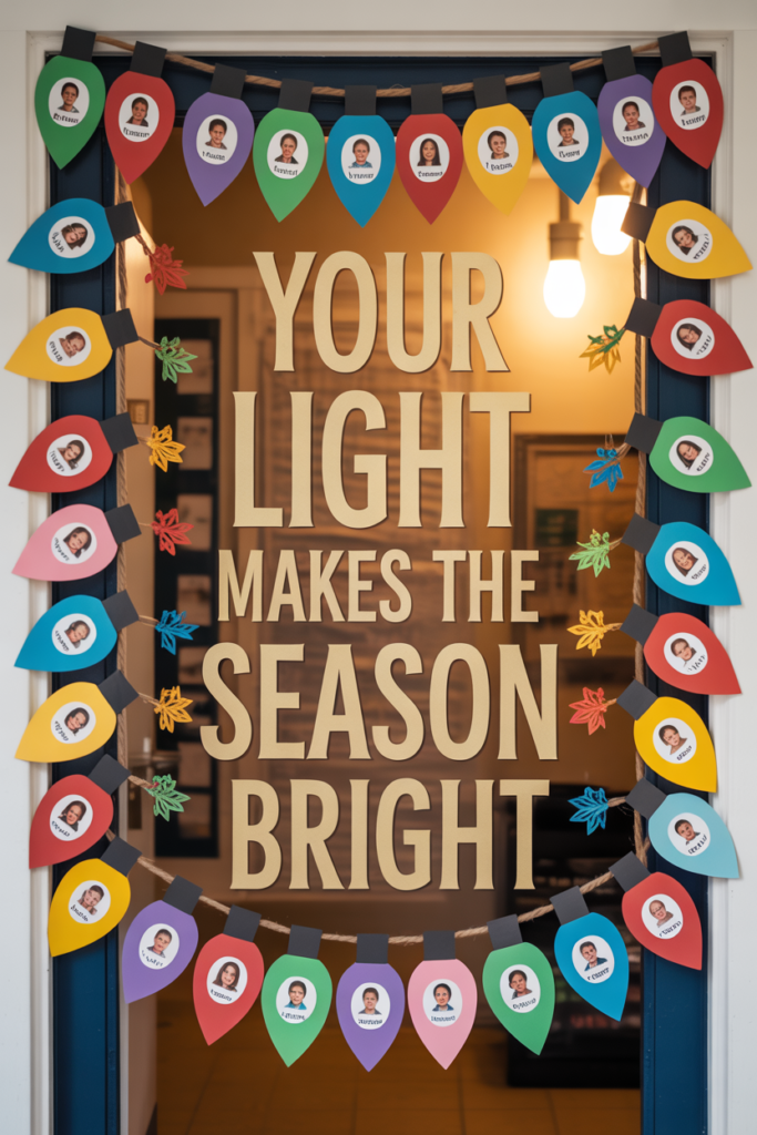 I design a string of colorful paper holiday lights with each bulb featuring a student’s name or photo. The message “Your Light Makes the Season Bright” celebrates how each student contributes to our classroom community.